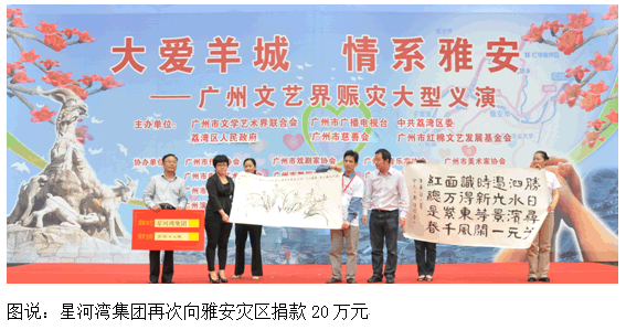 災(zāi)情牽動(dòng)了全體星河灣人的心。2013年4月27日,星河灣集團(tuán)積極響應(yīng)廣州市文學(xué)藝術(shù)界聯(lián)合會(huì)、廣州市慈善會(huì)、廣州市紅棉文藝發(fā)展基金會(huì)等機(jī)構(gòu)的號(hào)召,出席主題為“廣州市文藝界愛(ài)心獻(xiàn)雅安賑災(zāi)義演活動(dòng)”的捐款活動(dòng)。活動(dòng)呼吁全社會(huì)各界積極為災(zāi)區(qū)籌集善款,支持賑災(zāi)工作,現(xiàn)場(chǎng)所籌善款將統(tǒng)一由廣州市慈善會(huì)捐贈(zèng)給災(zāi)區(qū)。在每位觀眾心系災(zāi)區(qū)的時(shí)刻,活動(dòng)一開(kāi)始演藝協(xié)會(huì)的成員就為現(xiàn)場(chǎng)的觀眾帶來(lái)了感人十足的合唱歌曲《千里同心》,以表示對(duì)災(zāi)區(qū)的牽掛,廣州歌舞團(tuán)帶上廣府味十足的《西關(guān)小姐》音樂(lè)劇片段,一系列的義演帶動(dòng)了全場(chǎng)人員對(duì)雅安災(zāi)區(qū)的關(guān)注熱度,牽引了現(xiàn)場(chǎng)近萬(wàn)名愛(ài)心人士、各界企業(yè)紛紛伸出了援助之手,以全民相助共建雅安。