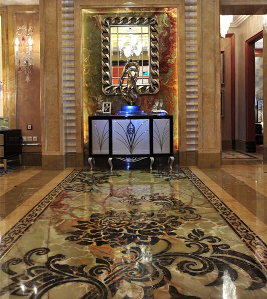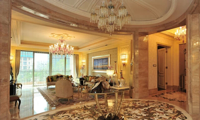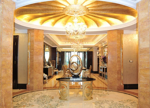 星河灣裝修使用的石材,超過幾十種,每一塊都經過精心挑選,注重石塊自然紋理的拼接,每一塊都像藝術品被使用在不同地方。在星河灣,帝皇玉石、帝皇金、黃水晶、佰麗黃……數十種高檔進口石材被綜合運用,地面拼花種類達幾十種之多,幾乎每個房間都能看到石材運用的效果。這些石材加工精細、紋路優美,其中的硬質石材按照曲線形式加工,多種石材無縫拼接,充分體現星河灣人的極致理念。