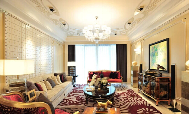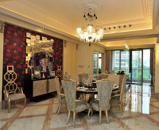 為保證室內格局呈中軸線對稱,星河灣在施工時取東西、南北會聚的中心點做中軸線吊頂并嚴格要求:吊頂形狀和地面拼花形狀統一對稱;餐廳吊頂、客廳吊頂與中軸吊頂統一水平線;門廳吊頂與中軸吊頂到底部臥室門前的小廳吊頂統一在同一垂直線上。