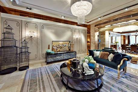 現代中式風格強調“中國元素、國際表達”。在色調上,或采用溫馨淡雅的淺色系,或采用簡潔明快的黑白對比;造型和圖案則多采用牡丹、回字紋、如意等中式意象,傳達美好寓意,旨在傳統與現代之間尋找與客戶在文化上的共鳴。
