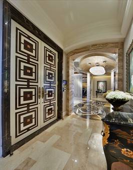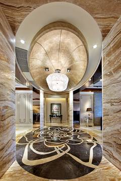 玄關采用傳統的牡丹拼花地面,天花的吊燈是甘露的造型,橢圓鑲金的設計,與地面拼花形成“天地合一”的設計。