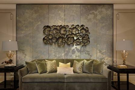 背景墻如意紋的鏡鋼邊框,曲線的鏡鋼工藝復雜,是為了本次現代中式樣板房專門打模制作。