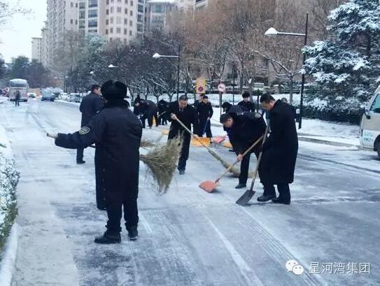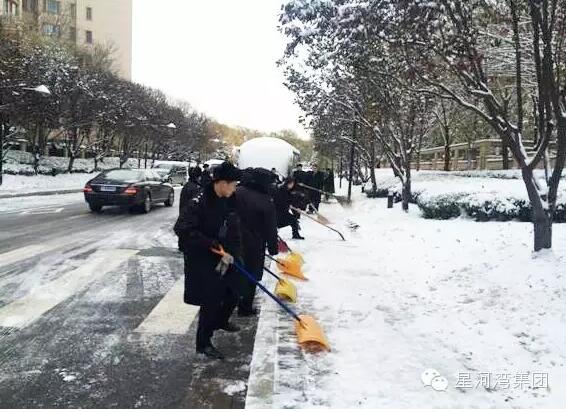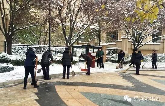 這是大雪來臨的早晨,7點剛過,北京星河灣物業公司的全體成員已經整裝到崗,集中清理星河中路及兩側道路的冰、雪,保障小區業主的安全出行。
