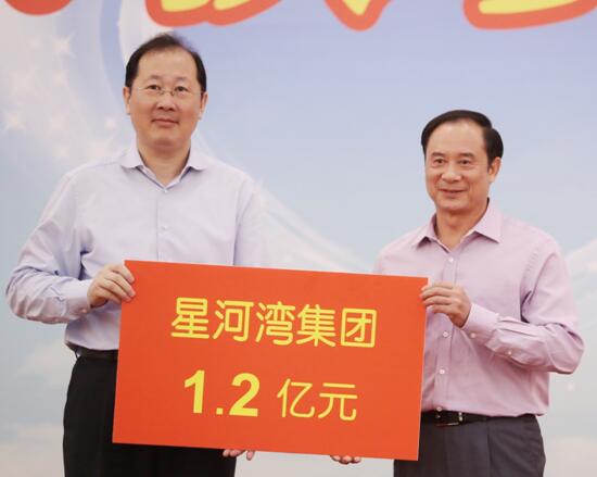 6月30日上午,星河灣集團參加“6.30廣東省扶貧濟困日”活動,黃文仔董事長在現場舉牌捐贈,金額為1.2億元。同時星河灣榮獲“2016年度廣東省扶貧濟困紅棉杯”金杯獎。