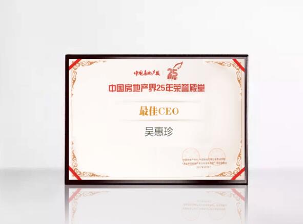 星河灣集團(tuán)副董事長(zhǎng)、執(zhí)行總裁吳惠珍女士榮獲中國(guó)房地產(chǎn)界25年榮譽(yù)殿堂—最佳CEO獎(jiǎng)。